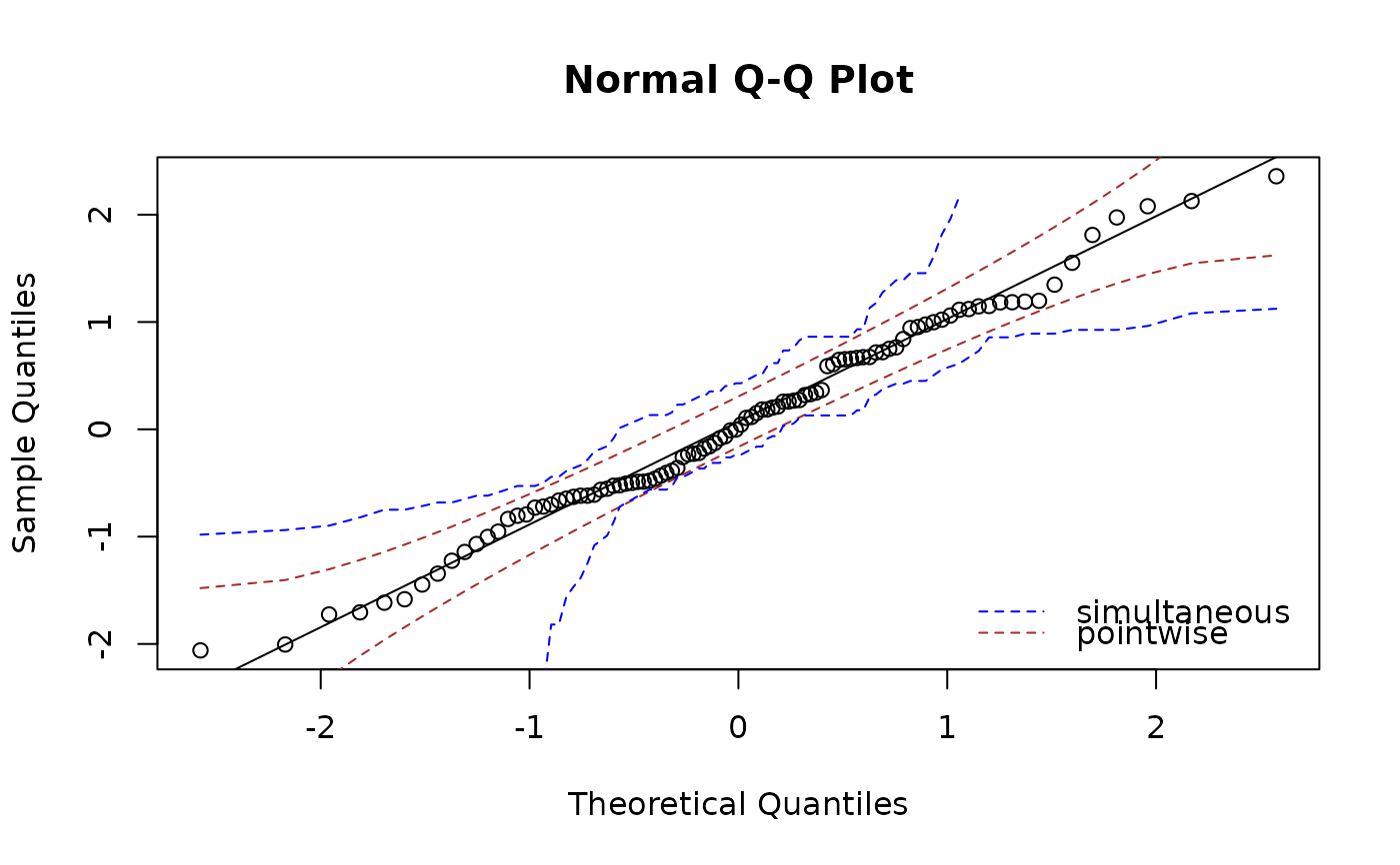 legend(1, -1.5, c("simultaneous", "pointwise"), col = c("blue", "brown"), lty = 2, bty = "n");